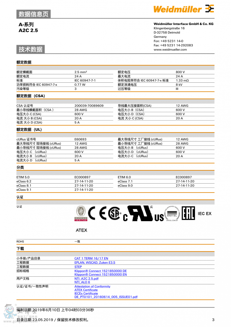 魏德米勒weidmulle直通型接線端子A2C 2.5訂貨號1521850000 |