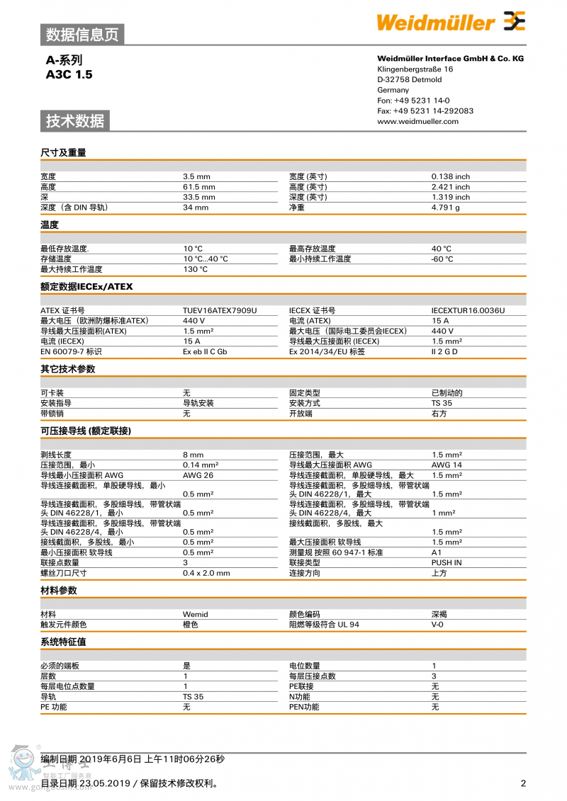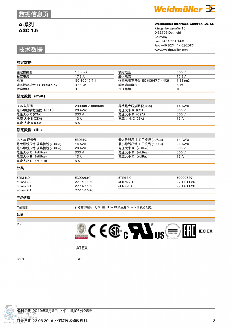 魏德米勒weidmulle直通型接線端子A3C 1.5訂貨號1552740000 |