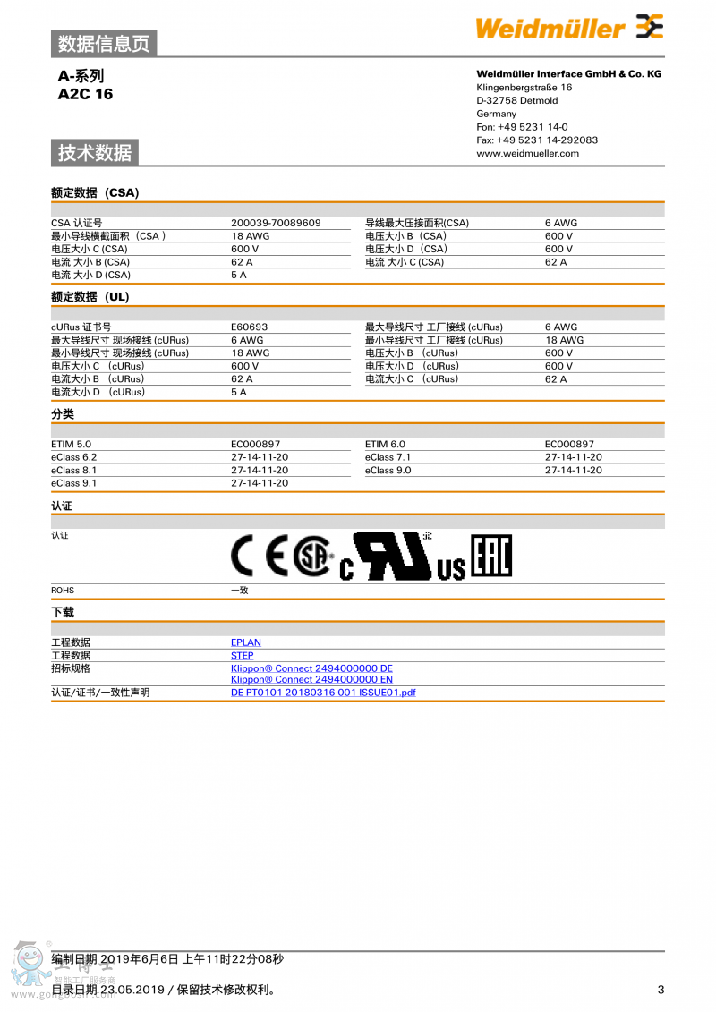 魏德米勒weidmulle直通型接線端子A2C 16訂貨號2494000000 |