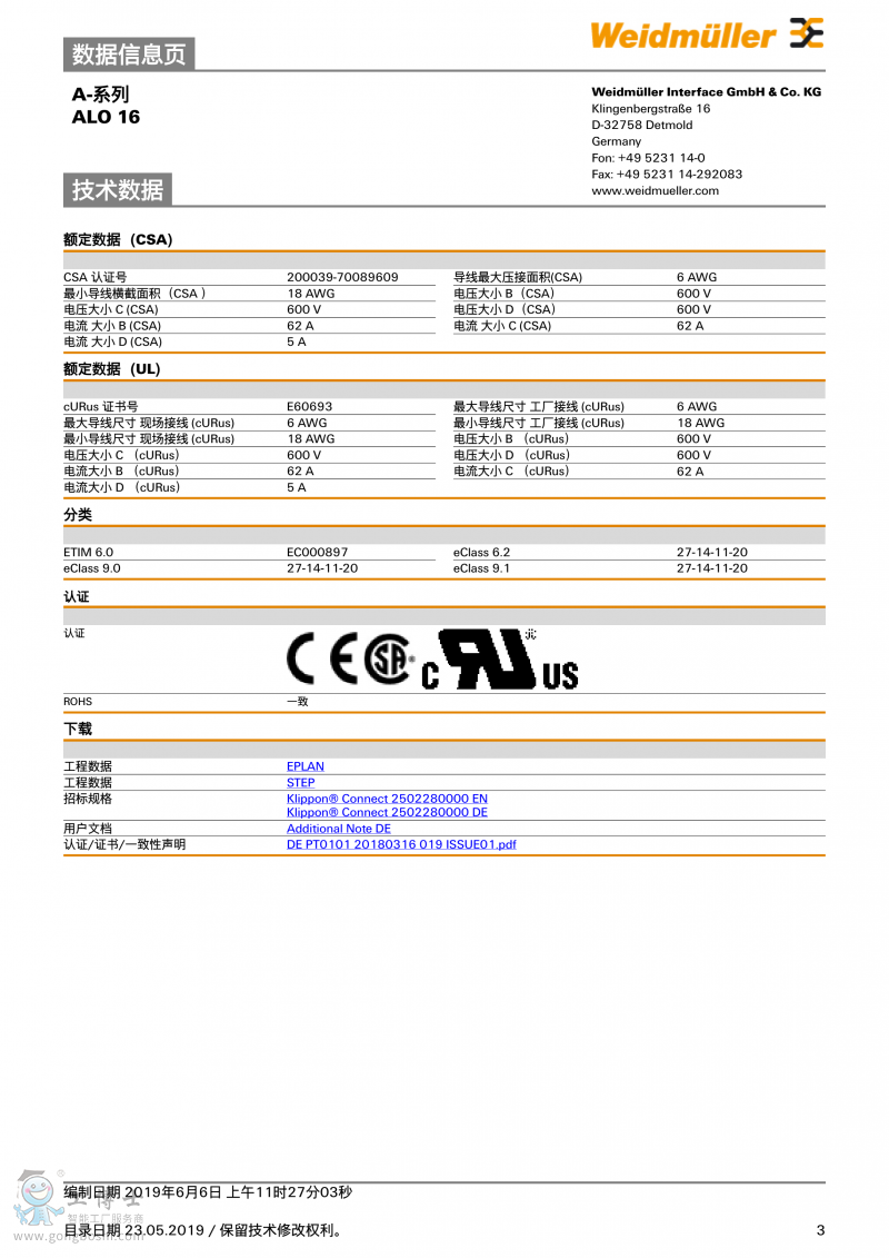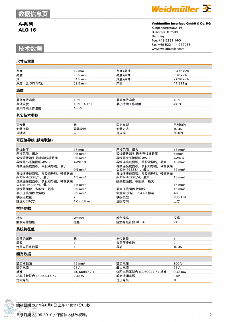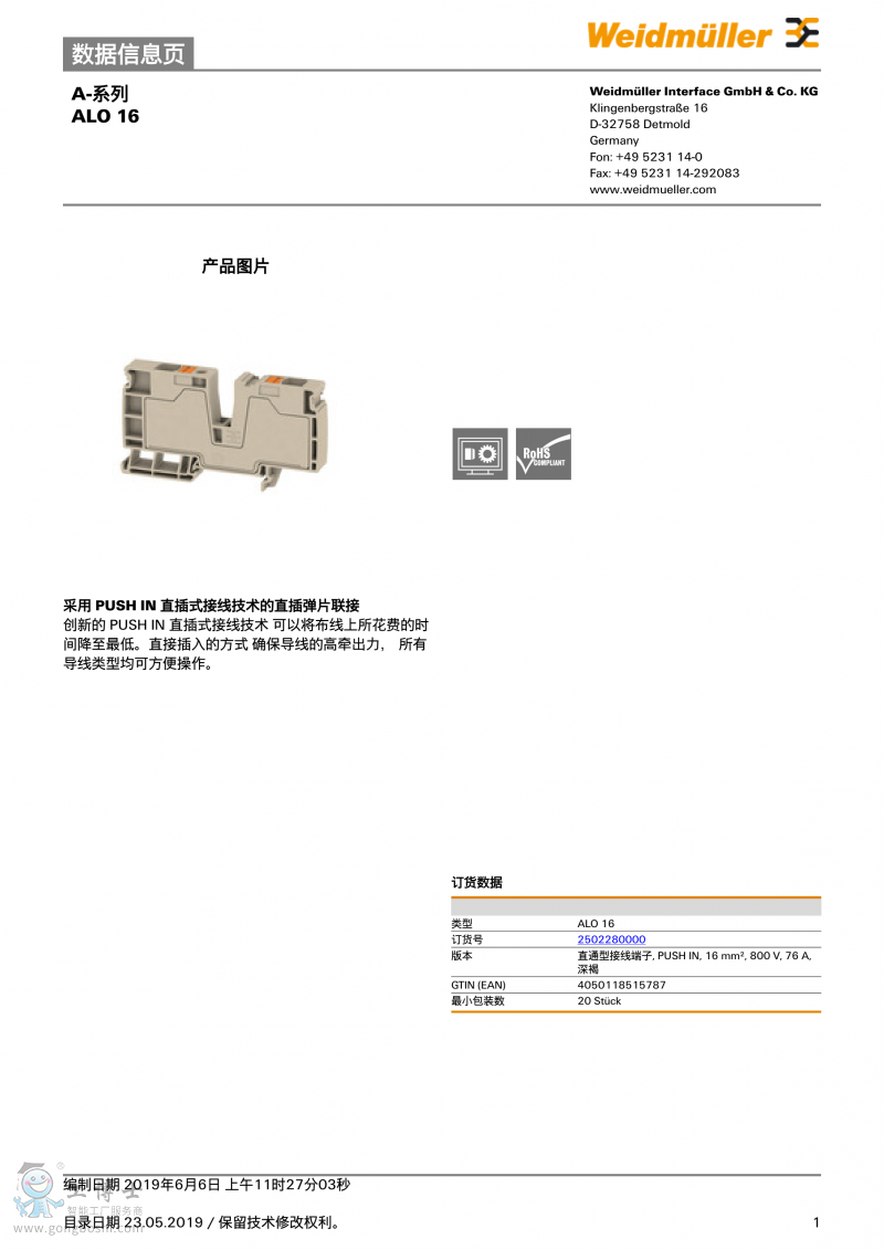 魏德米勒weidmulle直通型接線端子ALO 16訂貨號2502280000 |
