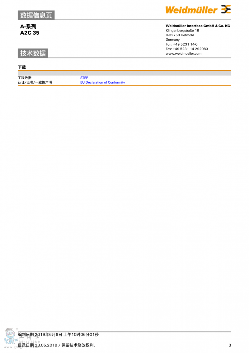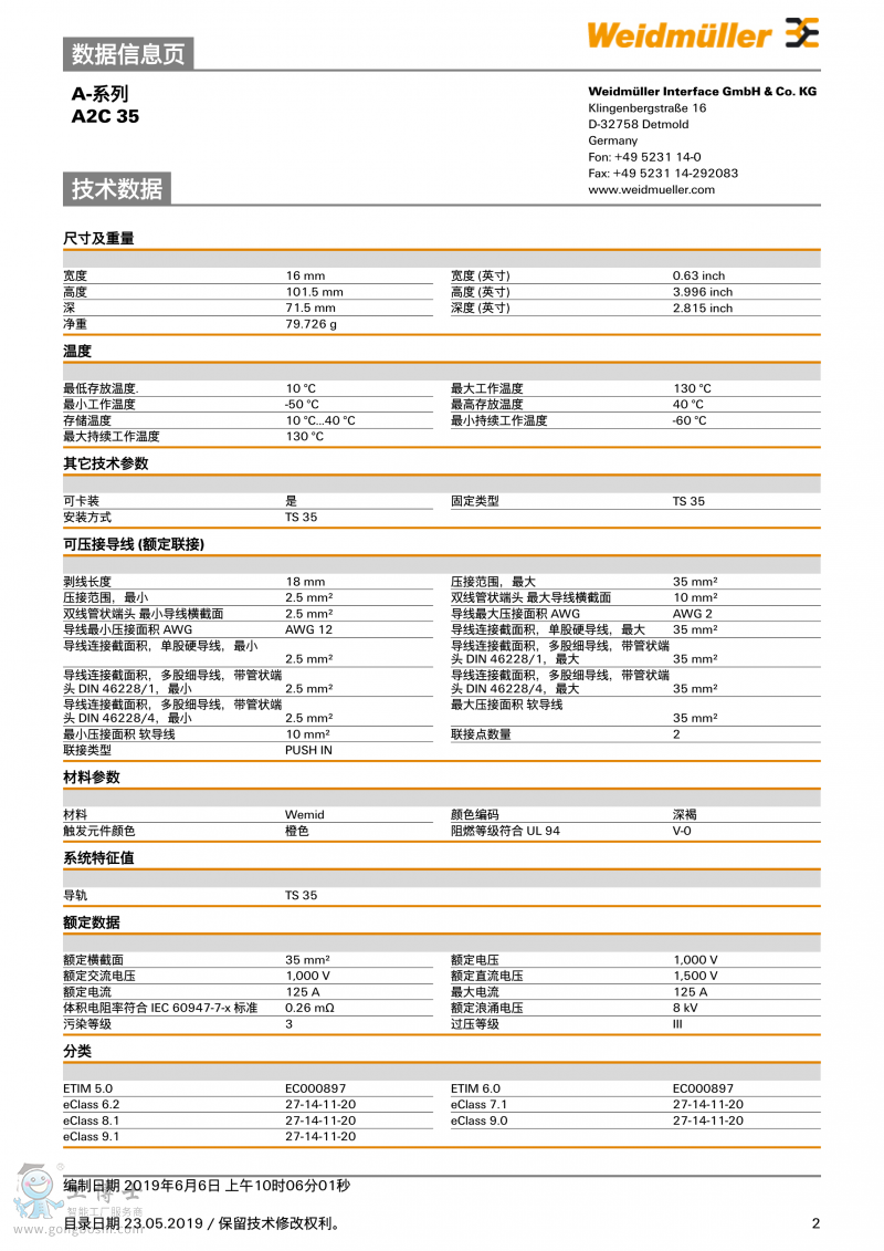 魏德米勒weidmulle直通型接線端子A2C 35訂貨號2551510000 |