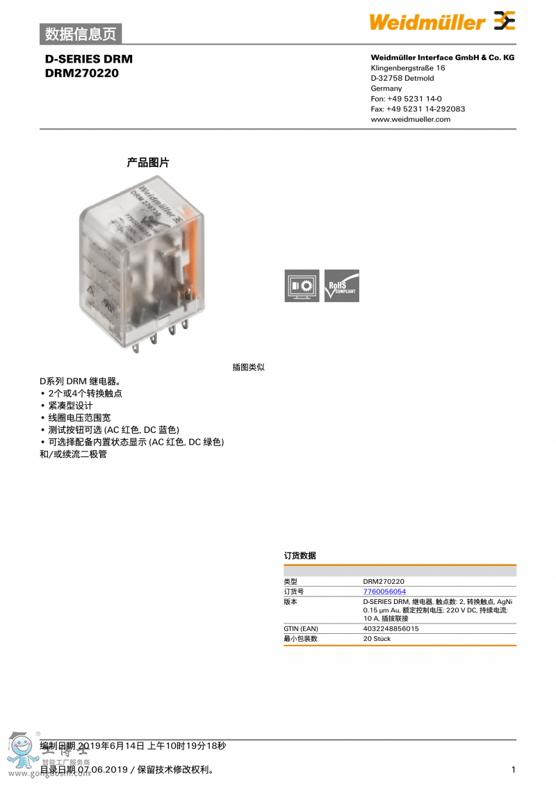 DRM270220魏德米勒weidmulle標準繼電器訂貨號7760056054 |
