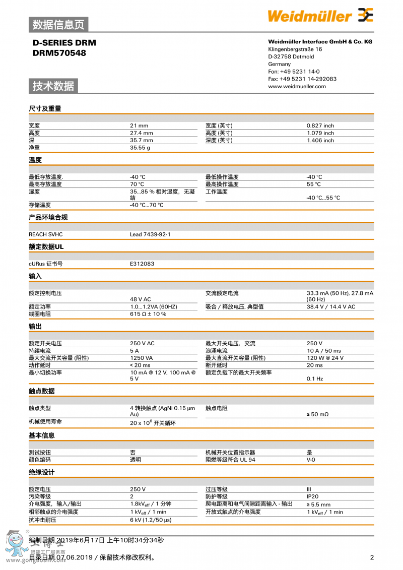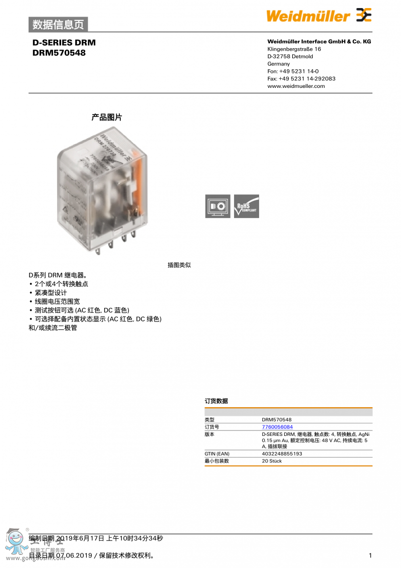 DRM570548魏德米勒weidmulle標準繼電器訂貨號7760056084 |