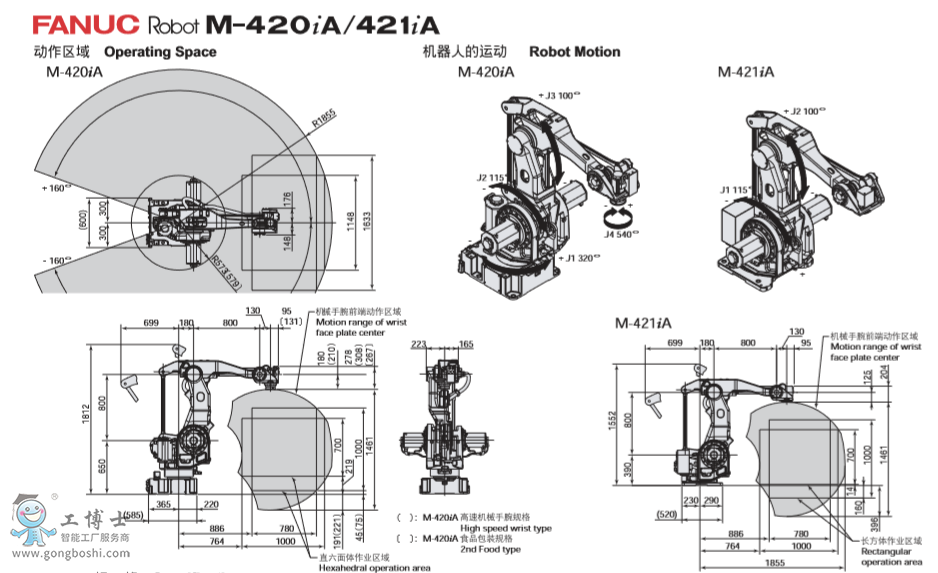 這是一款為物流系統的機器人化做出貢獻的物流智能機器人 可根據系統布局,選擇zui佳的軸配置類型。 FANUC Robot M-420iA: 4軸型 FANUC Robot M-421iA: 2軸型 具有*大3000次/小時的搬運能力。 通過活用*大50kg的可搬運能力,一次取出多個產品,從而提高 搬運作業效率。