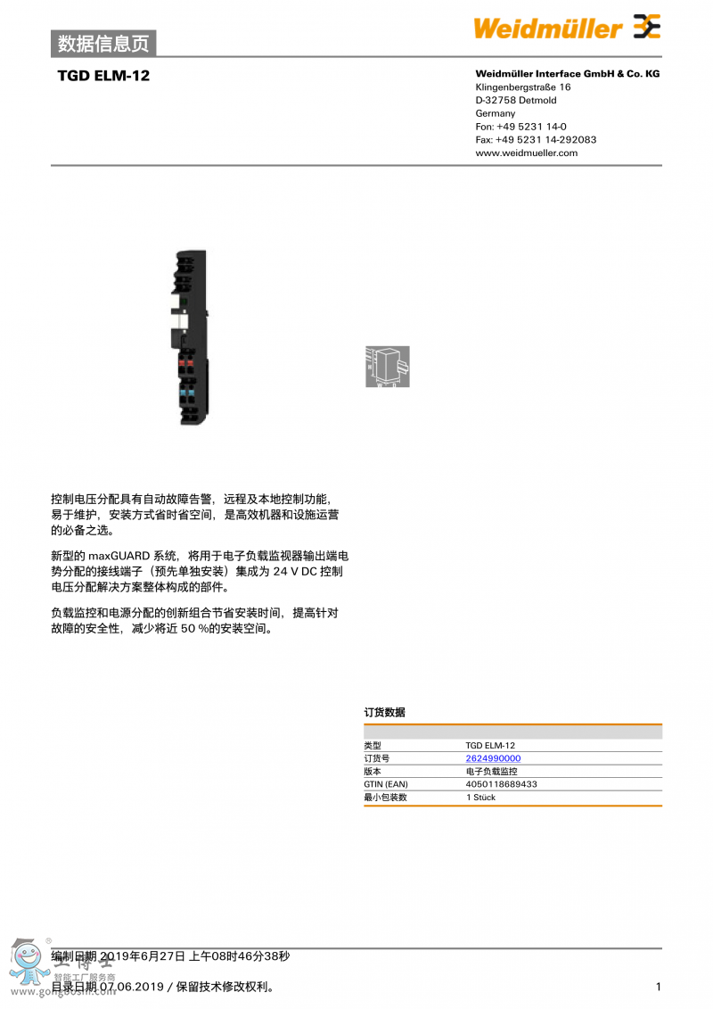 TGD ELM-12魏德米勒weidmuller maxGUARD分配器訂貨號2624990000 |