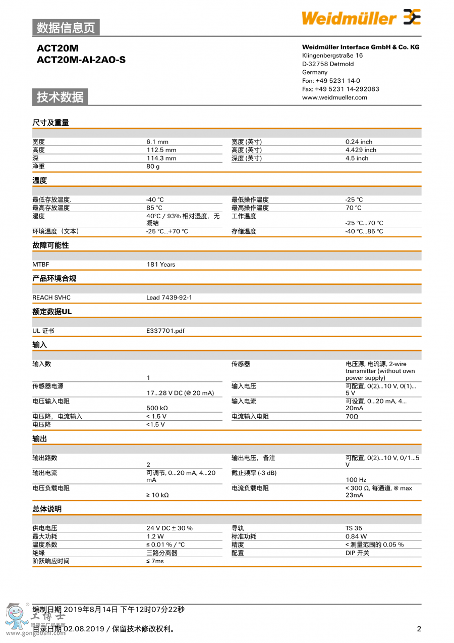 ACT20M-AI-2AO-S 魏德米勒weidmulle 信號分配器 訂貨號1176020000 |