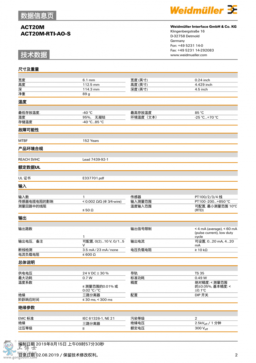 ACT20M-RTI-AO-S魏德米勒weidmuller信號分配器 訂貨號1375510000 |