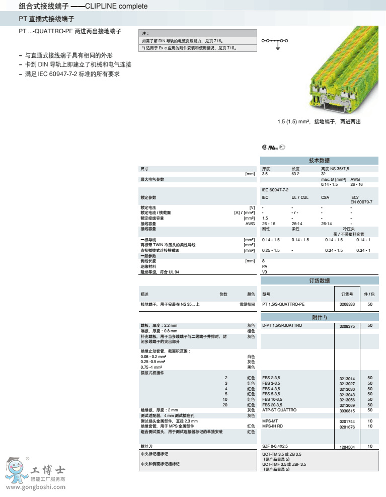 菲尼克斯phoenix直插式接線PT 1,5/S-QUATTRO-PE訂貨號3208333原裝現(xiàn)貨