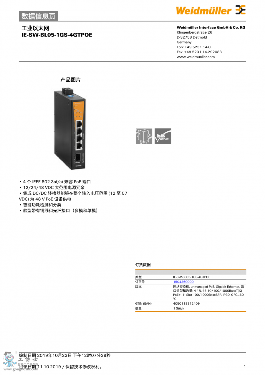IE-SW-BL05-1GS-4GTPOE 魏德米勒 網絡交換機 訂貨號1504360000 |
