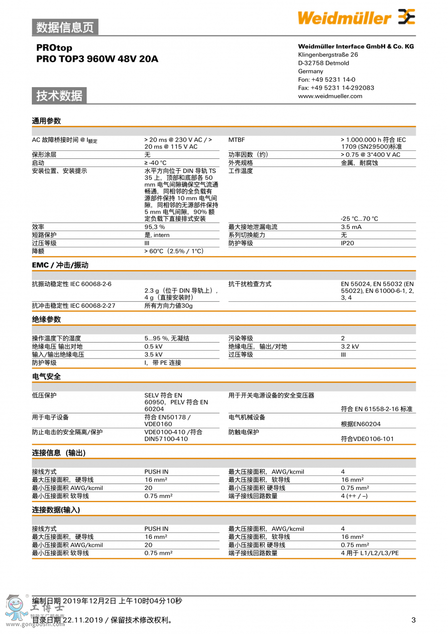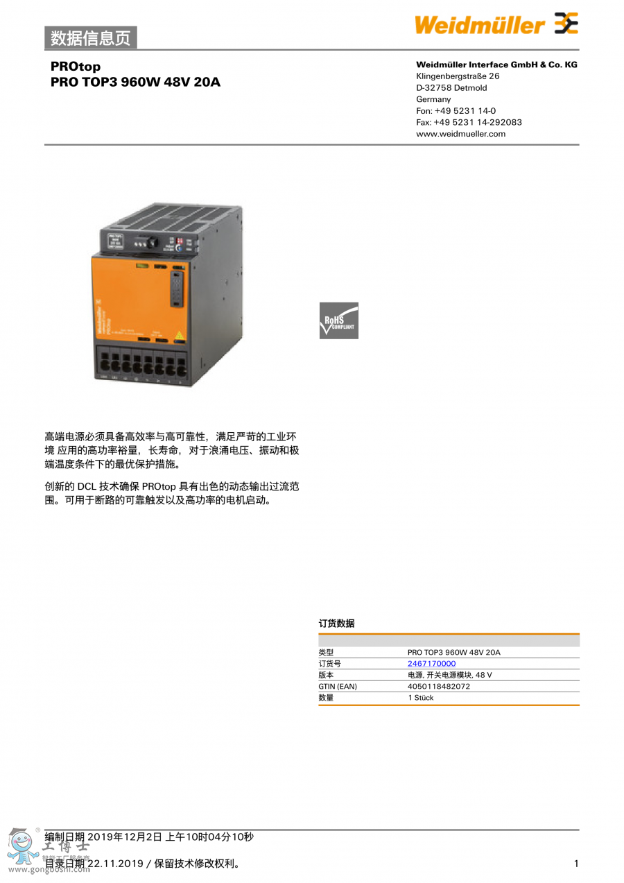 PRO TOP3 960W 48V 20A 魏德米勒 開關電源模塊 訂貨號2467170000 |