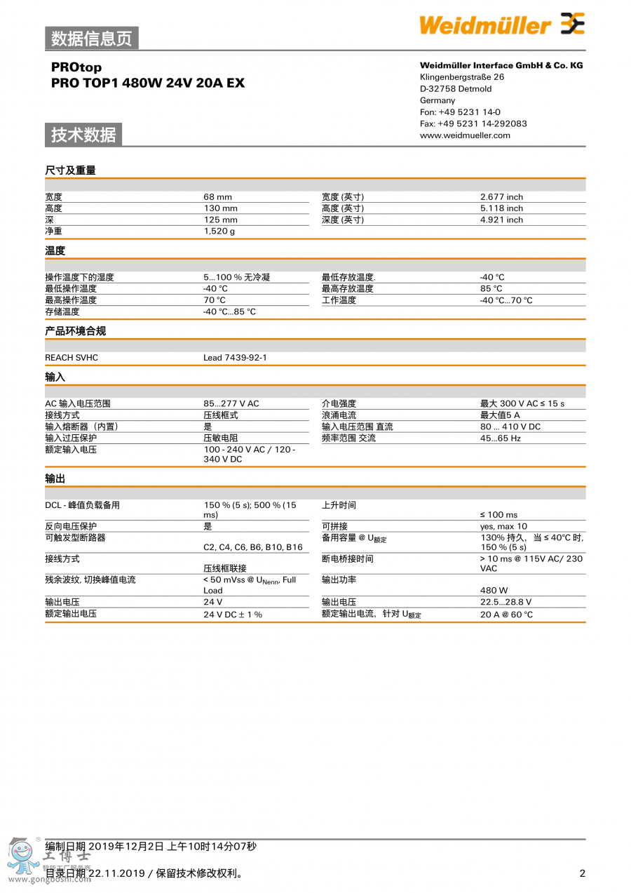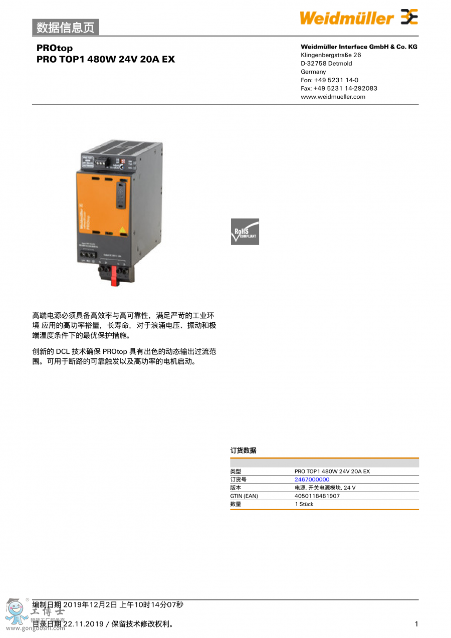 PRO TOP 480W 48V 10A EX 魏德米勒 開(kāi)關(guān)電源模塊 訂貨號(hào)2467040000 |