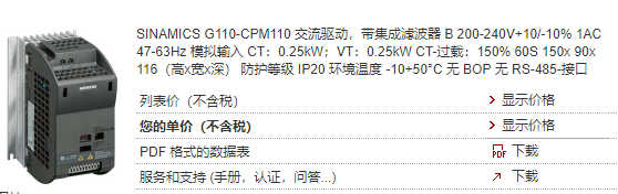 產品說明 SINAMICS G110-CPM110 交流驅動,帶集成濾波器 B 200-240V+10/-10% 1AC 47-63Hz 模擬輸入 CT:0.25kW;VT:0.25kW CT-過載:150% 60S 150x 90x 116(高x寬x深) 防護等級 IP20 環境溫度 -10+50°C 無 BOP 無 RS-485-接口
