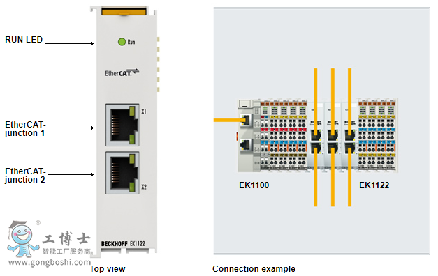 2 端口 EtherCAT 接口端子模塊可以用來配置 EtherCAT 星型拓撲結構。在一個站點中,使用多個 EK1122 模塊可實現模塊化的 EtherCAT 星型拓撲結構。可將單個設備或整個 EtherCAT 網段直接連接到接口端子模塊的端口上。EtherCAT 分支器通過 RJ45 母頭連接,直接顯示鏈路狀態和激活狀態。運行 LED 用于指示 EK1122 的狀態。通過 TwinCAT 或其它適用的 EtherCAT 主站,EK1122 也支持整個 EtherCAT 網段在運行期間的連接和斷開連接(熱連接)。