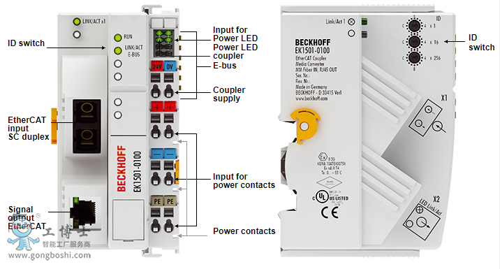 EK1501 耦合器用于連接 EtherCAT 與 EtherCAT 端子模塊(Elxxxx)。一個站點由一個 EK1501 耦合器、任意多的 EtherCAT 端子模塊、一個 EL9011 總線末端端子模塊或一個 EtherCAT 擴展端子模塊 EK1110 組成。該耦合器將來自 100BASE-FX 以太網的傳遞報文轉換為 E-bus 信號。使用多模玻璃光纖連接,兩個耦合器之間的距離可達 2 千米 — 而如果使用單模玻璃光纖連接的 Ek1501-0010,兩個耦合器之間的距離甚至可以達到 20 千米。