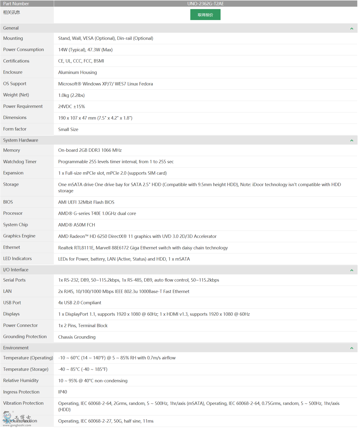 研華科技 小型智慧工廠數據網關 UNO系列 UNO-2362G AMD®雙核T40E處理器