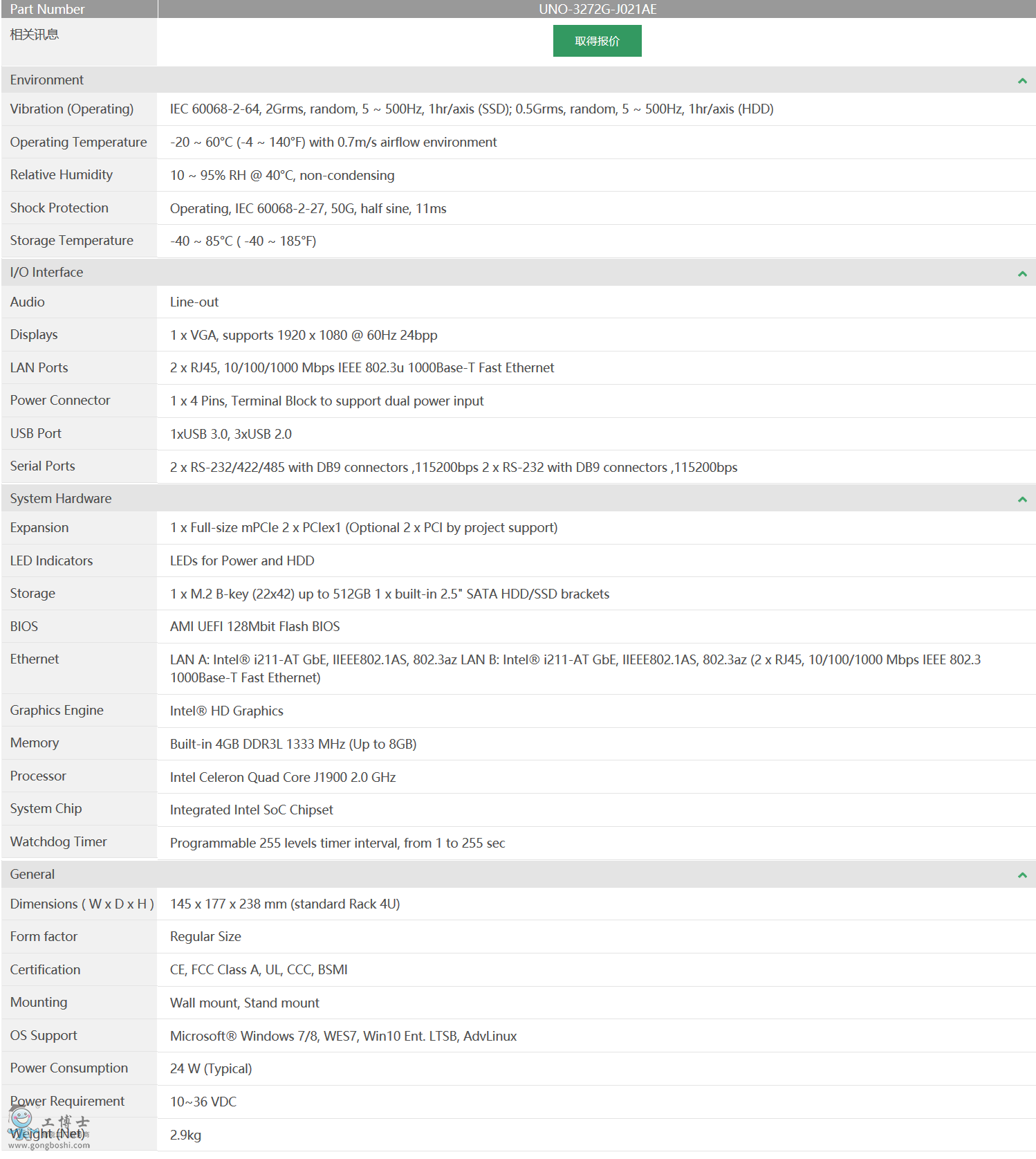 研華科技 嵌入式無風扇工業電腦 UNO系列 UNO-3272G 英特爾®賽揚® J1900
