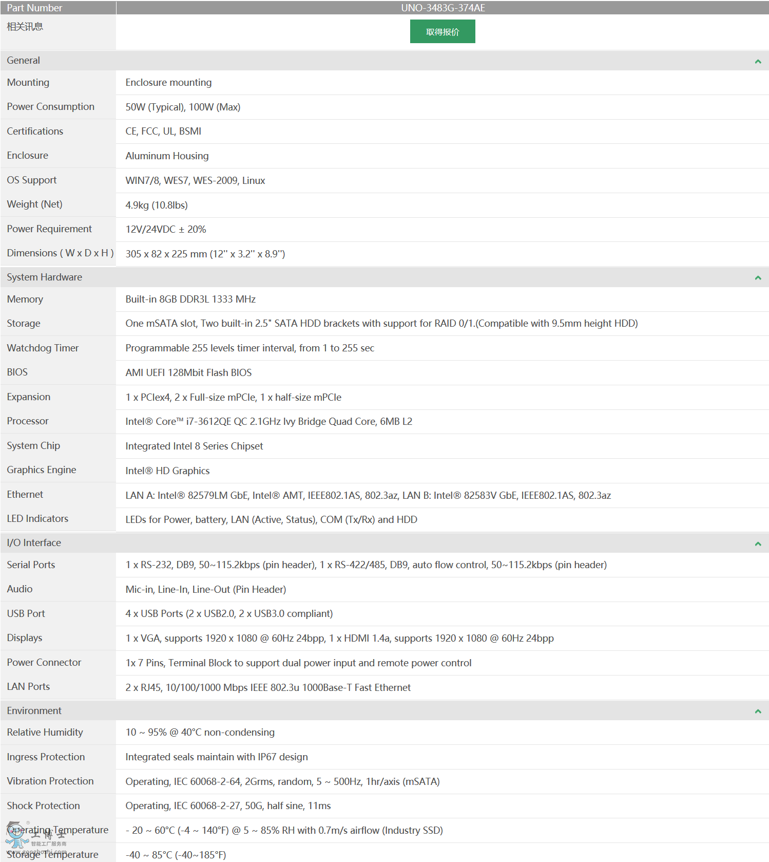 研華科技 嵌入式無風扇工業電腦 UNO系列 UNO-3483G 第三代 Intel® 四核處理器