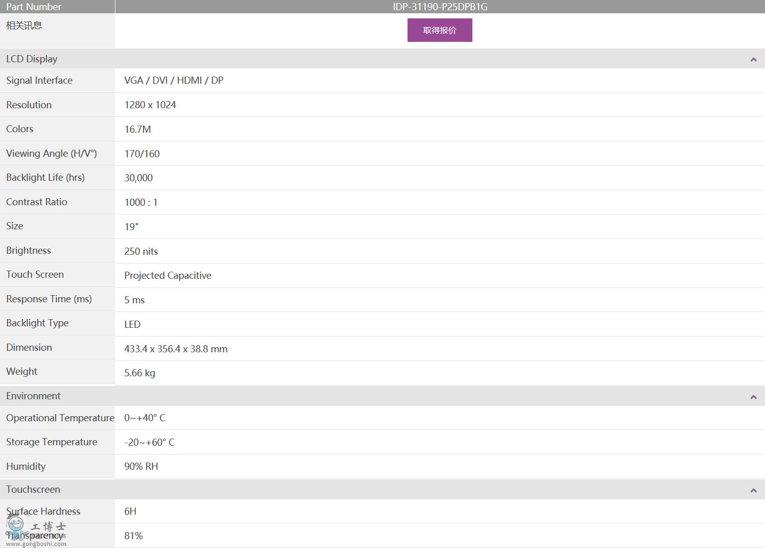 屏幕素質: 19”LCD 面板,帶 LED 背光燈,使用壽命更長