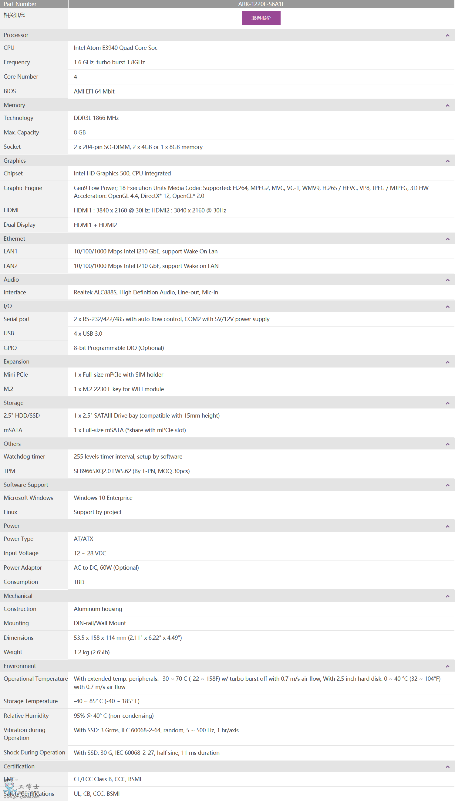 研華工控機(jī) 嵌入式工控機(jī) ARK-1000系列 ARK-1220L 英特爾凌動 E3940 |