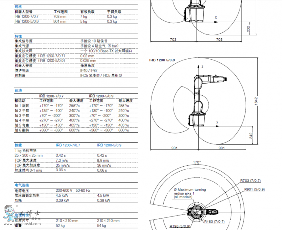 作為一個(gè)機(jī)器人系列,IRB 1200提供的兩種型號(hào)廣泛適用于各類作業(yè)。兩種型號(hào)都可選配食品級(jí)潤(rùn)滑、SafeMove2、鑄造專家II代和潔凈室防護(hù)等級(jí)。這兩種型號(hào)的工作范圍分別為700 mm和900 mm,*大有效負(fù)載分別為7 kg和5 kg。