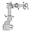機(jī)器人本體采用安川 MOTOMAN-MH5LS小型 6軸旋轉(zhuǎn)關(guān)節(jié)機(jī)器人,其各個(gè)軸的旋轉(zhuǎn)方向如圖2所 示。其中 S 、 L 、 U 、 R 、 B 、 T 分別表示機(jī)器人從主基座到機(jī)器人手臂執(zhí)行末端的各軸,當(dāng)焊***安裝于執(zhí)行器末端時(shí),焊***末端的位移與焊***姿態(tài)可由機(jī)器人各關(guān)節(jié)控制達(dá)到。