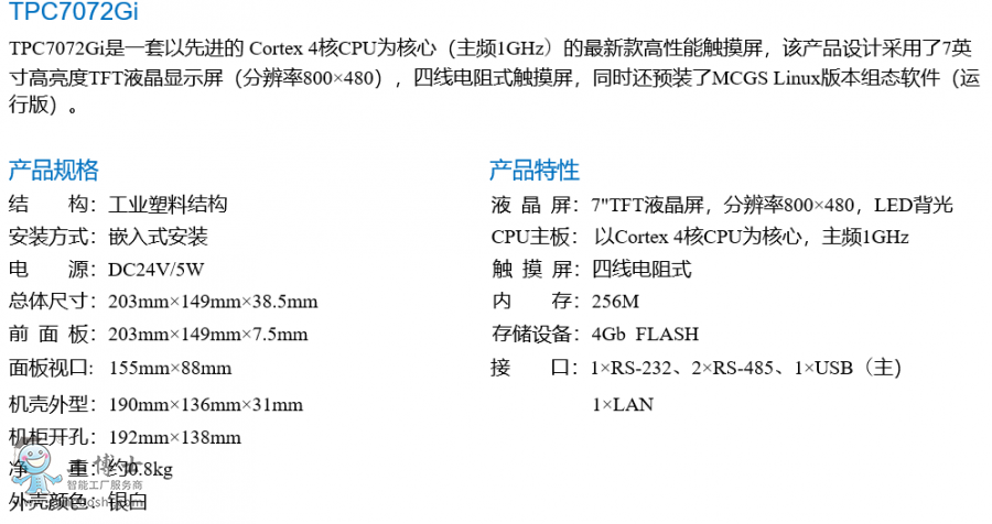 TPC7072Gi,是采用 4核(主頻1GHz)CPU為核心的超高性能嵌入式一體化觸摸屏。該產品設計采用了7英寸高亮度TFT液晶顯示屏(分辨率800×480),四線電阻式觸摸屏,以及具有良好的電磁屏蔽性。同時還預裝了MCGS嵌入式組態軟件(運行版),具備強大的圖像顯示和數據處理功能。