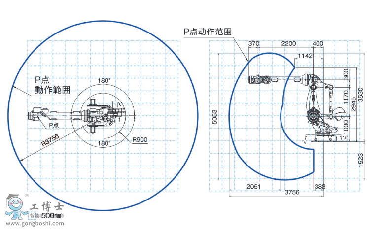 | 注)1、在電纜不通過第6軸的中空部位時,根據使用條件的不同,動作范圍***大可以擴伸至±360° |