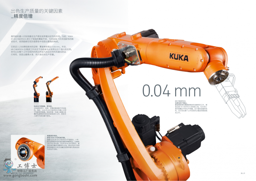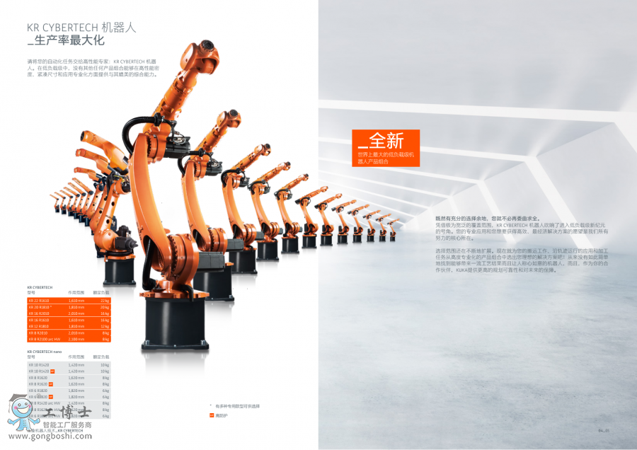 在低負(fù)載等級(jí)中,KR CYBERTECH 系列工業(yè)機(jī)器人能夠提供世界范圍內(nèi)齊全、擁有高功率密度的產(chǎn)品系列。該系列與節(jié)省空間的單元精簡(jiǎn)設(shè)計(jì)理念完美契合,在確保性能的同時(shí)可以大程度地降低后續(xù)成本。 低負(fù)荷機(jī)器人 KR CYBERTECH 系列下的高性能多功能機(jī)器人專門用于搬運(yùn)應(yīng)用:搬運(yùn)大型工件、加工、裝配、碼垛和保護(hù)氣體焊接。可通過 KR C4 oder KR C4 extended 對(duì)機(jī)器人進(jìn)行控制。 更多關(guān)于庫(kù)卡機(jī)器人資料請(qǐng)咨詢:http://kuka-palletizer.gongboshi.com/