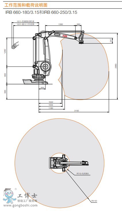 高速版IRB 660機器人全速時有效載荷可達180kg,而高產量250kg版機器人的到達距離***長可達3.15m。