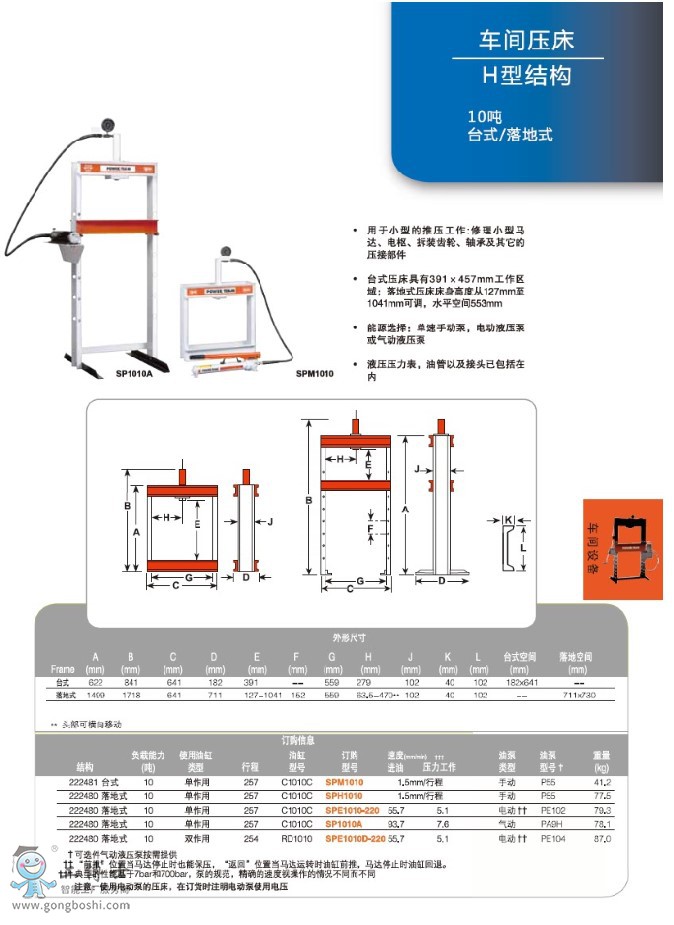 ●用于小型的推壓工作:修理小型馬達、電樞、拆裝齒輪、軸承及其它的壓接部件 臺式壓床具有391 x 457mm工作區域;落地式壓床床身高度從127mm至1041mm可調,水平空間553mm