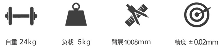 - 臂展為1008mm,可滿足工作范圍在886.5mm以內的作業任務