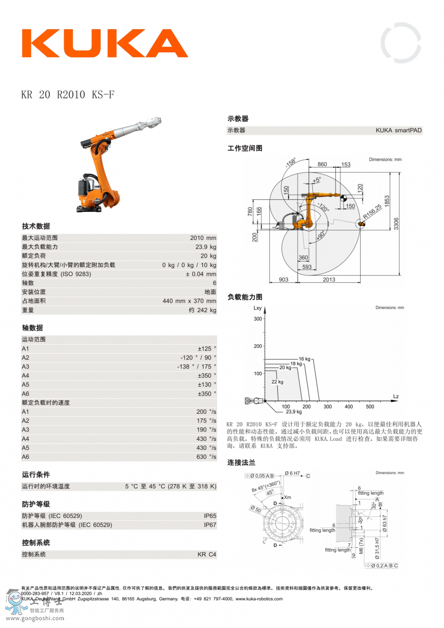 KR IONTEC 是一臺靈活度極高的機器人,擁有其所屬級別的極佳工作范圍,并可置于任意安裝位置,適用于 20 至 70 千克負載能力范圍的各種不同應用。
