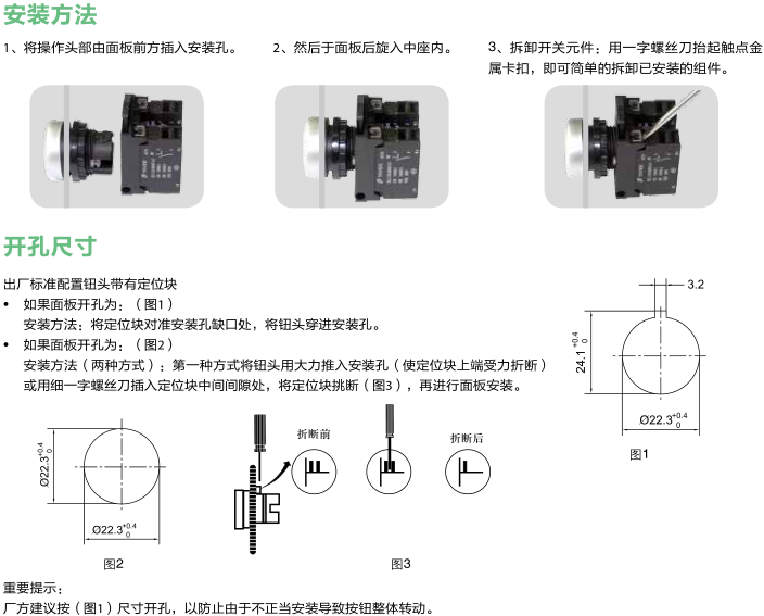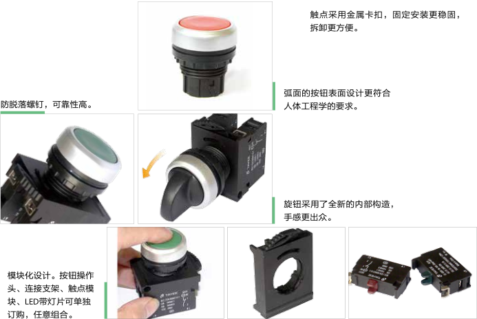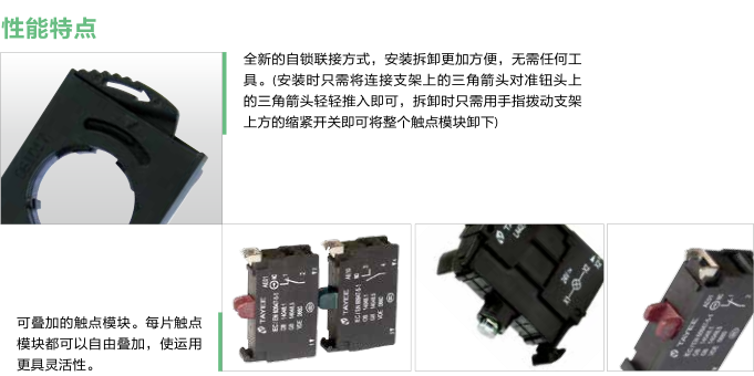 •  全新的自鎖聯結方式,安裝拆卸更加方便,無需任何工具。(安裝時只需將連接支架上的三角箭頭對準扭頭上的三角箭頭輕輕推入即可,拆卸時只需用手指撥動支架上方的縮緊開關即可將整個觸點模塊卸下)