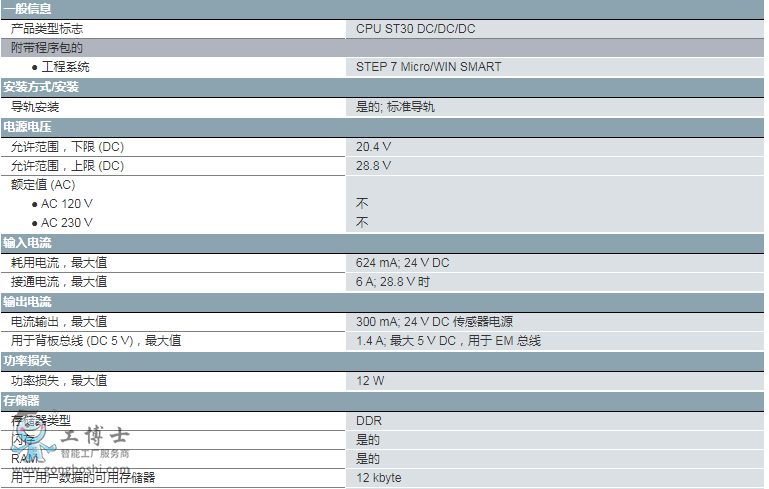SIMATIC S7-200 SMART,CPU ST30, 標準 CPU,DC/DC/DC, 機載 I/O: 18 個 24V DC 數字輸入;12 DO 24V DC; 電源:直流 20.4-28.8V DC, 程序存儲器/數據存儲器 30 KB