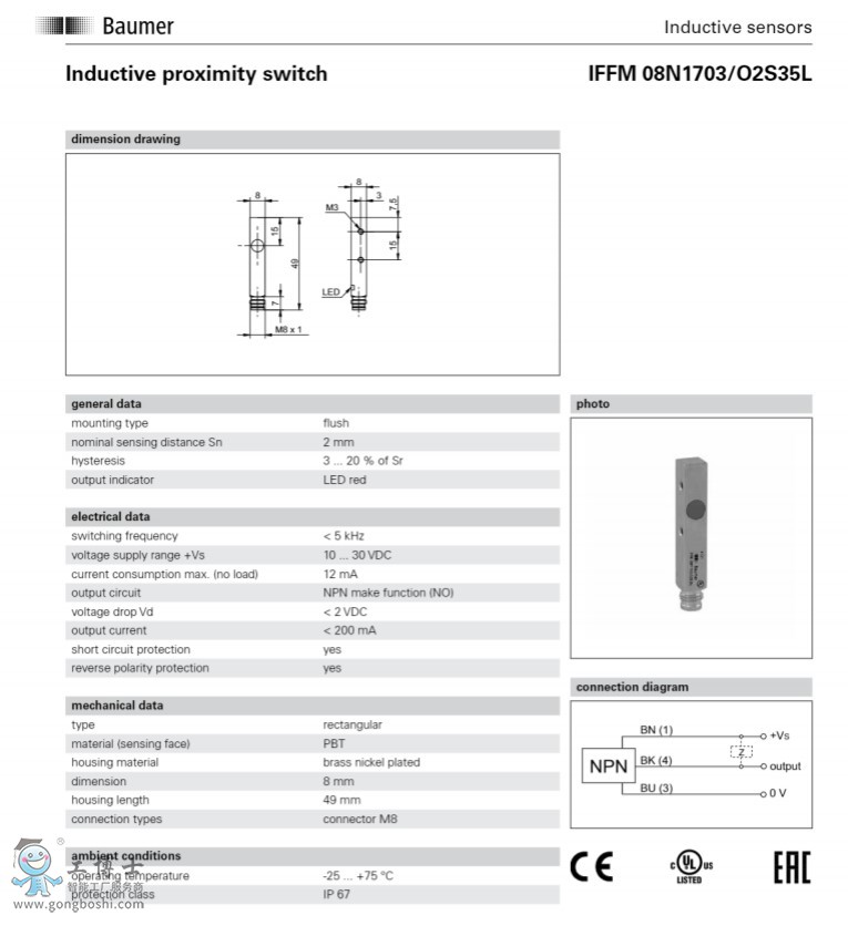 Baumer/堡盟IFFM 08P3703/O2S35L 電感式接近開關傳感器