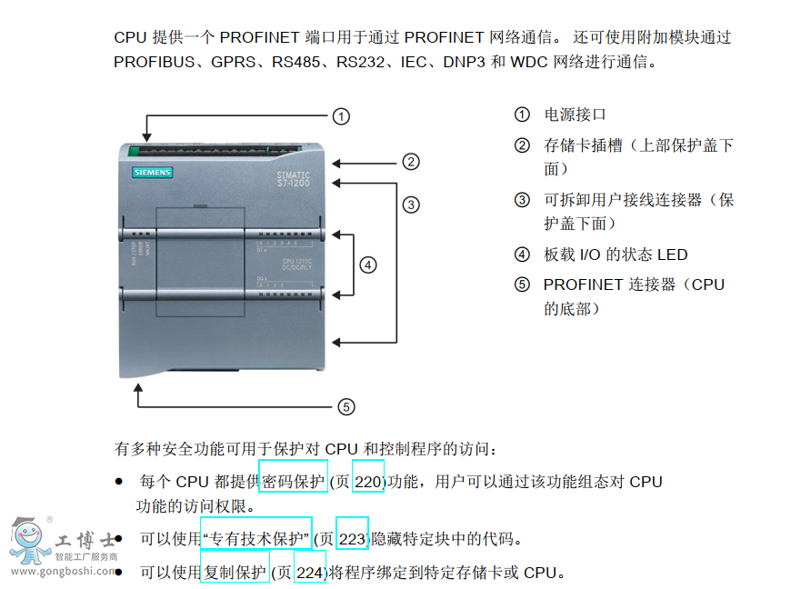 CPU將微處理器、集成電源、輸入和輸出電路、內置PROFINET、高速運動控制lO以及板載模擬量輸入組合到一個設計緊湊的外殼中來形成功能強大的控制器。