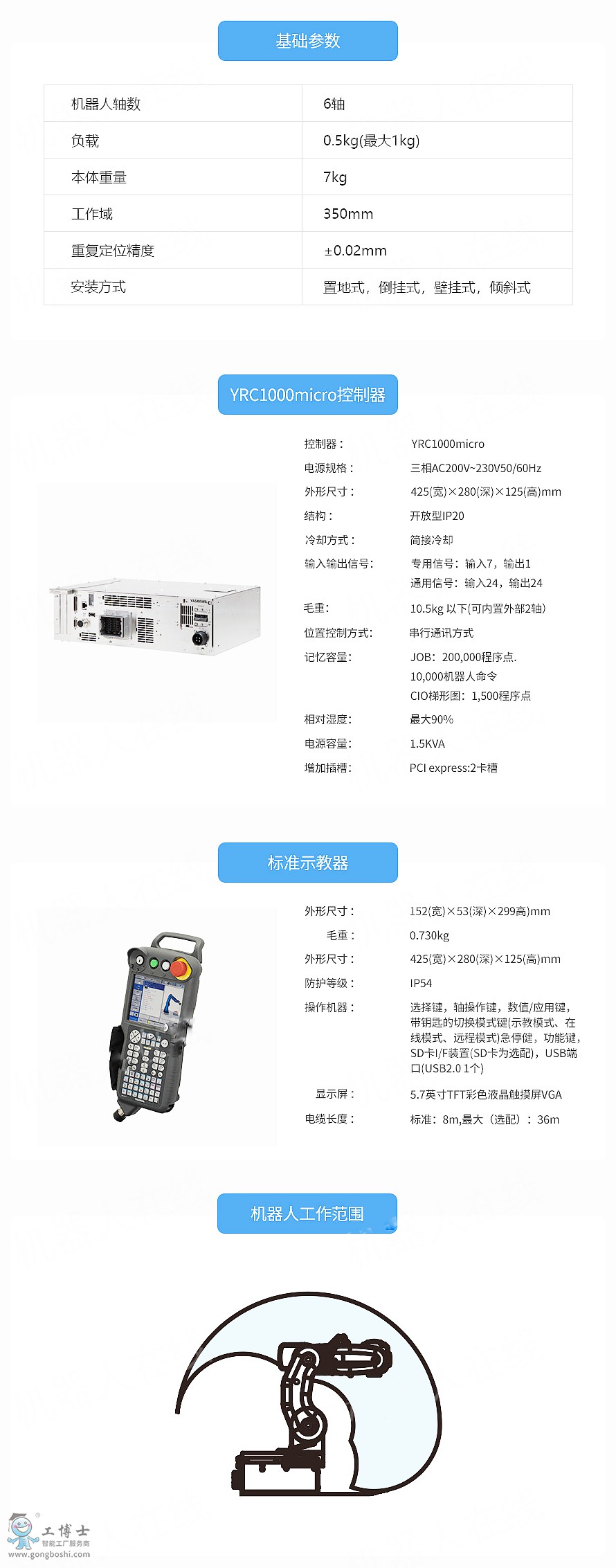 控制柜:YRC1000micro 小級機器人 小型、輕便:便于搬運 ●憑借緊湊型設(shè)計,不僅可在更小(191x124mm)面積中構(gòu)建機器人系統(tǒng),并且還可安裝在裝置內(nèi)部。 ●本體重量約7kg,達到人可搬運的重量,實現(xiàn)無需行車進行搬運。 ●行走裝置等周邊系統(tǒng)也可進行小型化設(shè)計,可構(gòu)建緊湊型生產(chǎn)線。 高速:本公司小型機器人中優(yōu)異的高速性能 ●與本公司現(xiàn)有小型機器人(「MOTOMAN-GP8」或「MOTOMAN-MHJ」)相比實現(xiàn)了更高的加速度,為客戶提高生產(chǎn)力做出了積極貢獻。