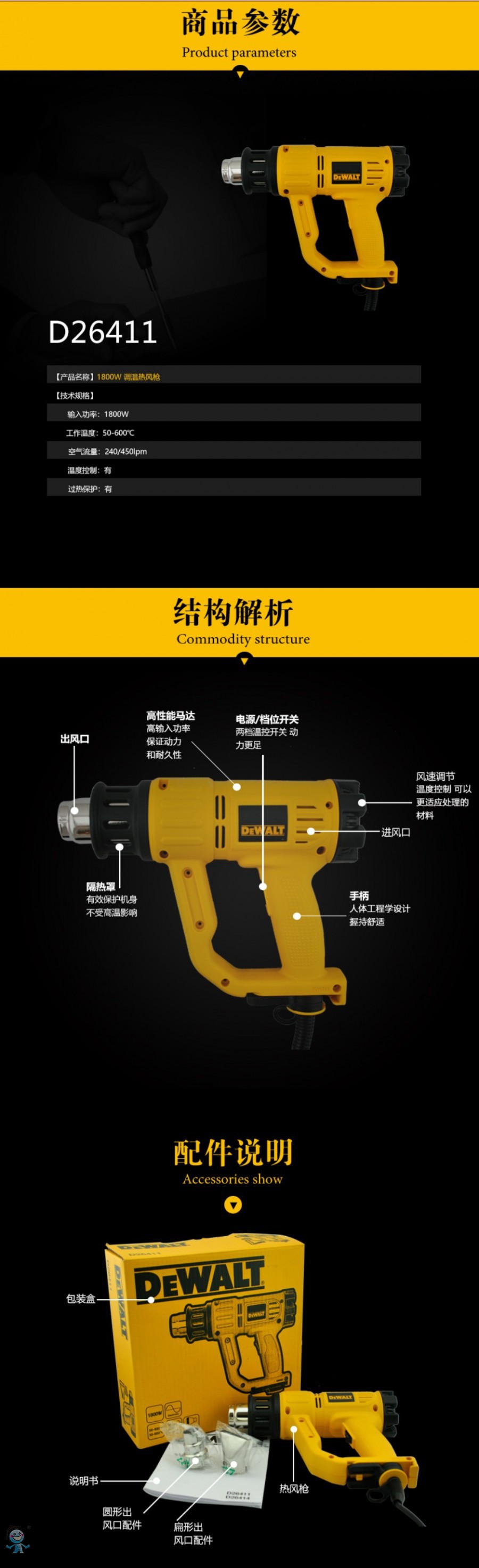 得偉可調溫熱風槍1800W 汽車貼膜烤槍烘槍 吹熱風機 工業熱縮膜塑料焊槍D2641
