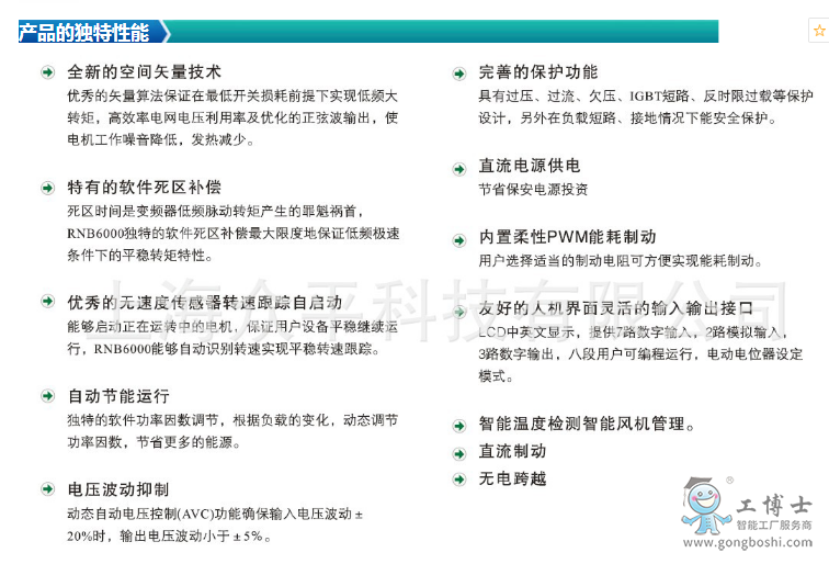 ***的矢量算法保證在*低開關損耗前提下實現低頻大轉矩,高效率電網電壓利用率及優化的正弦波輸出,使電機工作噪音降低,發熱減少。