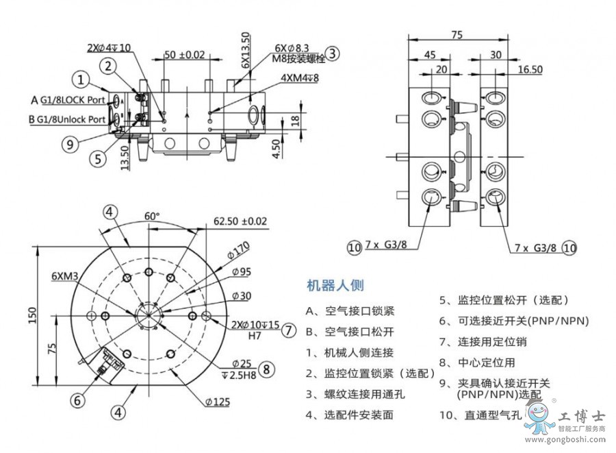 工博士機器人末端快換裝置以高精度、高強度、高性能的產(chǎn)品優(yōu)勢是單臺機器人能夠在制造和裝備過程中更換不同的末端執(zhí)行器以增加柔性,讓機器人充分發(fā)揮性能,完成多重作業(yè),提高效率。