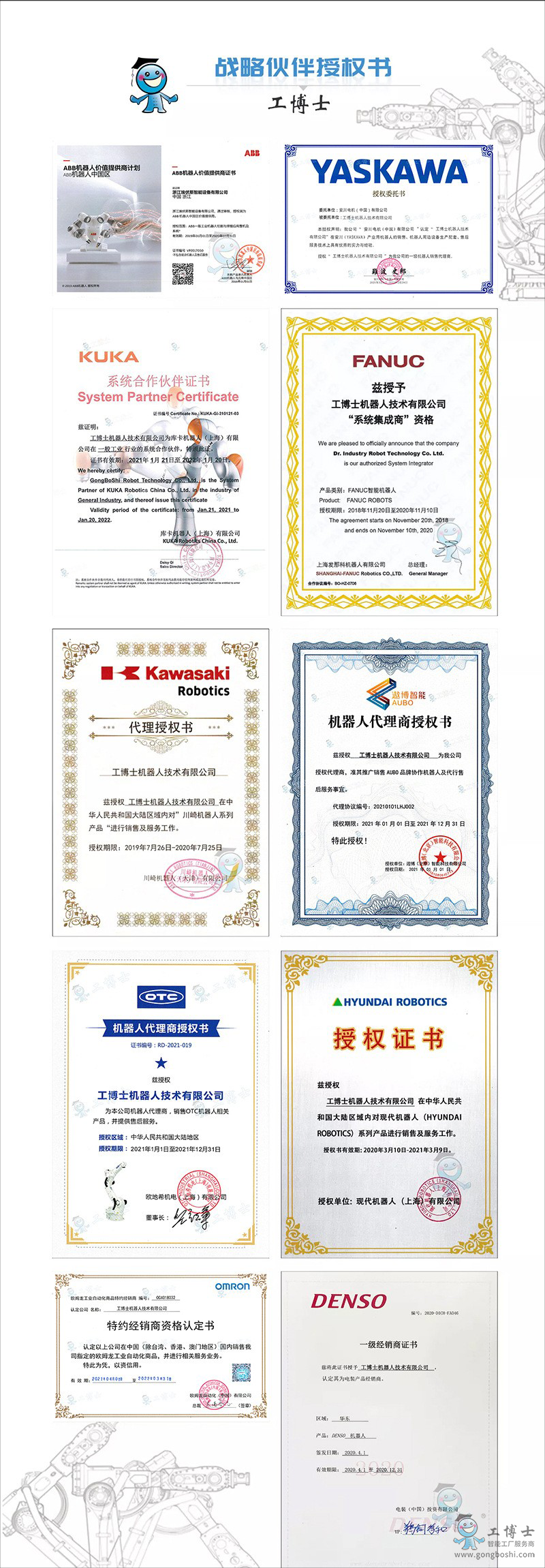 工博士機器人技術有限公司致力于為您提供ABB庫卡KUKA安川YASKAWA發那科FANUC歐地希OTC川崎Kawasaki遨博AUBO現代HYUNDAI電裝DENSO歐姆龍OMRON愛普生EPSON等進口機器人銷售、項目集成、機器人代理、機器人配件、機器人售后維保、機器人培訓一站式服務等優質服務!!!