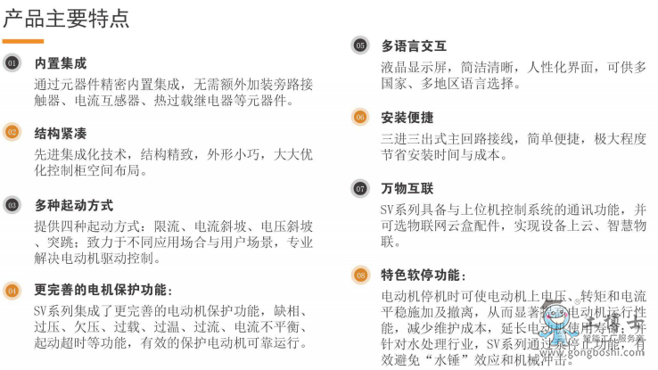 軟起動器集成多種電機保護功能,如過流、過載、缺相、晶閘管短路、過熱保護、內部接觸器故障、相電流不平衡等,確保電機及軟起動器在故障或誤操作時不被損壞。