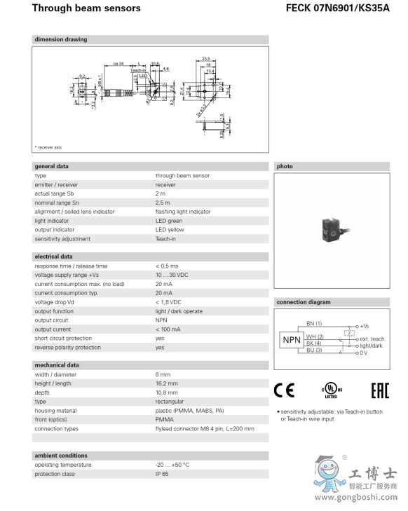 Baumer 堡盟 開關傳感器FECK 07P6901/KS35 A 對射式光電傳感器