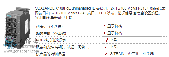 SCALANCE X108PoE unmanaged IE 交換機,2x 10/100 Mbit/s RJ45 電源轉以太網端口和 6x 10/100 Mbit/s RJ45 端口, LED 診斷,錯誤信號 觸點含設置按鈕, 冗余電源 手冊可供下載 |