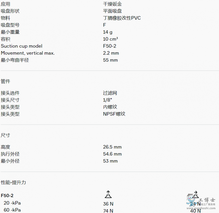 適用于硬紙板、鈑金、玻璃和多孔材料等平坦工件。該吸盤采用夾板結構,不僅可防止工件被吸入吸盤內部而導致變形,而且在提升力平行作用于工件表面時還能增加摩擦力。產品穩定性好,在工作期間幾乎不會發生任何偏移。