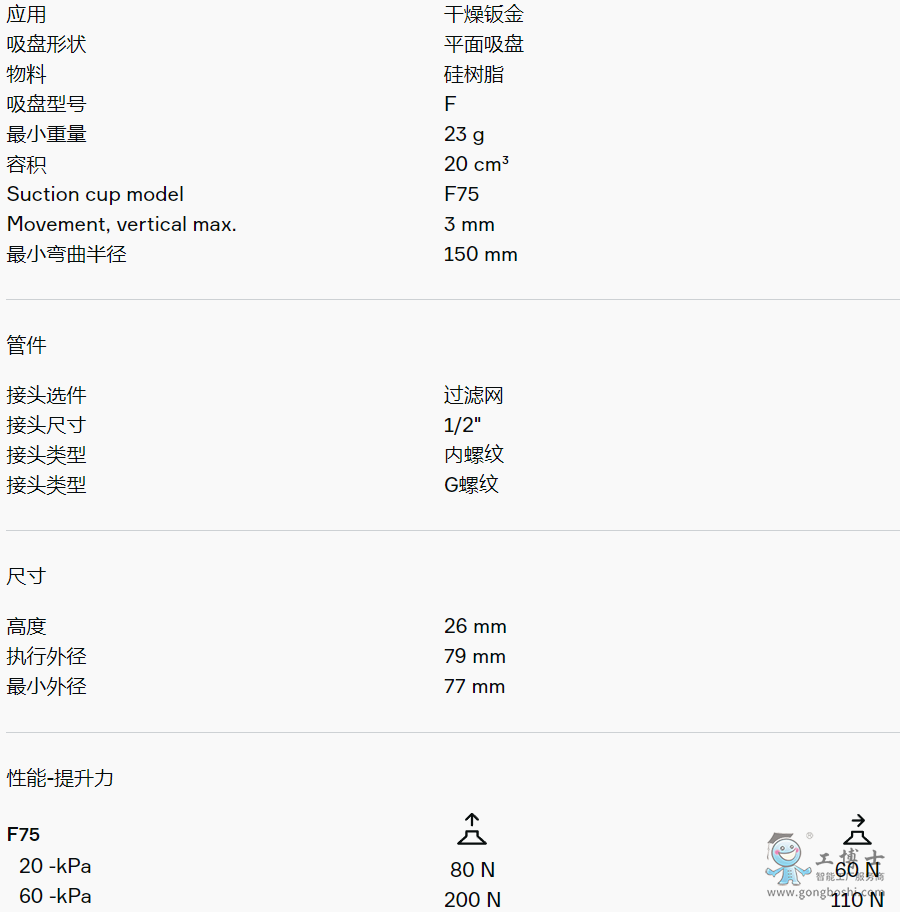 適用于硬紙板、鈑金、玻璃和多孔材料等平坦工件。該吸盤采用夾板結(jié)構(gòu),不僅可防止工件被吸入吸盤內(nèi)部而導(dǎo)致變形,而且在提升力平行作用于工件表面時還能增加摩擦力。產(chǎn)品穩(wěn)定性好,在工作期間幾乎不會發(fā)生任何偏移。