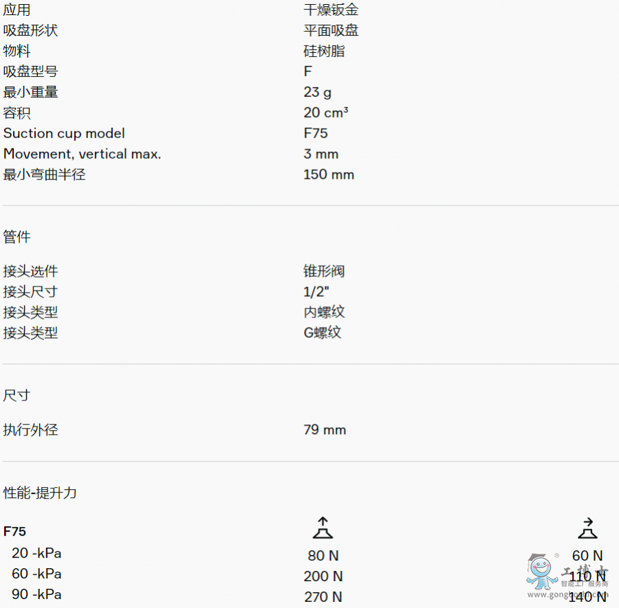 適用于硬紙板、鈑金、玻璃和多孔材料等平坦工件。該吸盤采用夾板結構,不僅可防止工件被吸入吸盤內部而導致變形,而且在提升力平行作用于工件表面時還能增加摩擦力。產品穩定性好,在工作期間幾乎不會發生任何偏移。