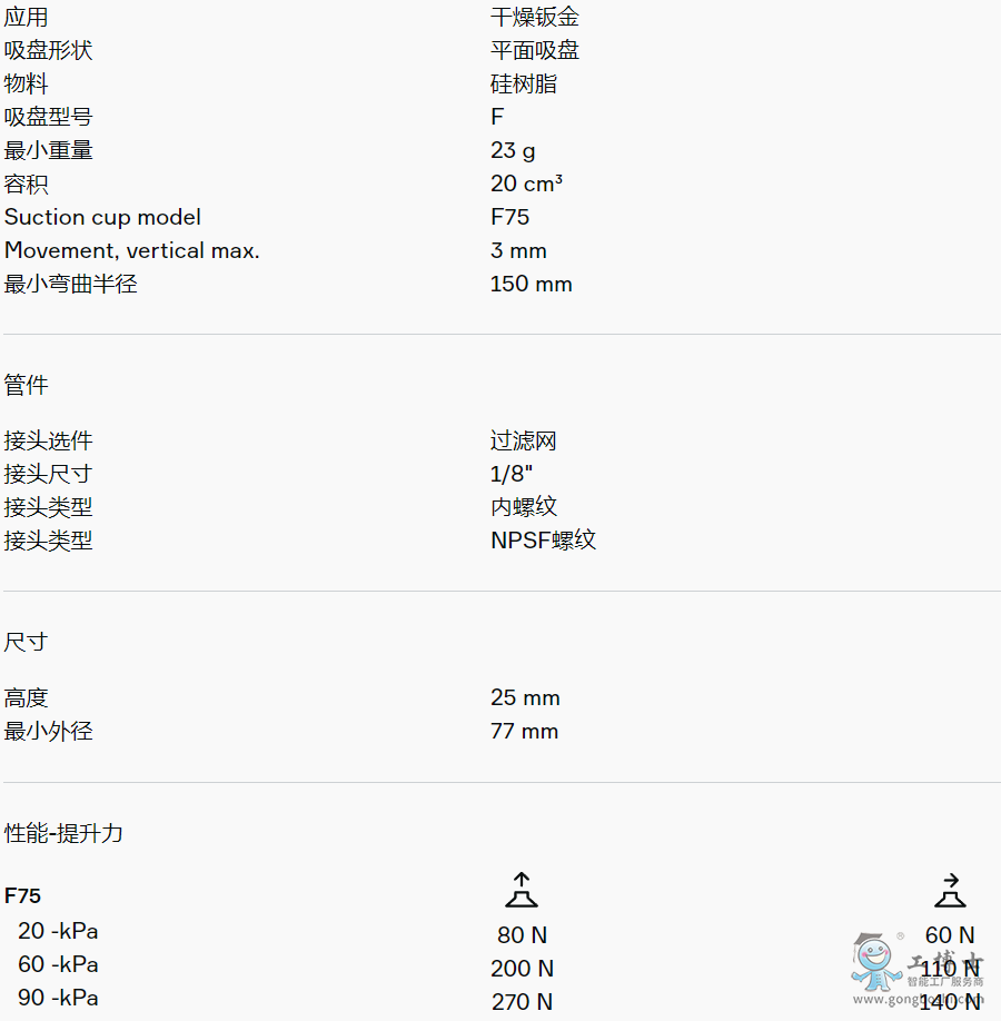 適用于硬紙板、鈑金、玻璃和多孔材料等平坦工件。該吸盤采用夾板結(jié)構(gòu),不僅可防止工件被吸入吸盤內(nèi)部而導(dǎo)致變形,而且在提升力平行作用于工件表面時還能增加摩擦力。產(chǎn)品穩(wěn)定性好,在工作期間幾乎不會發(fā)生任何偏移。