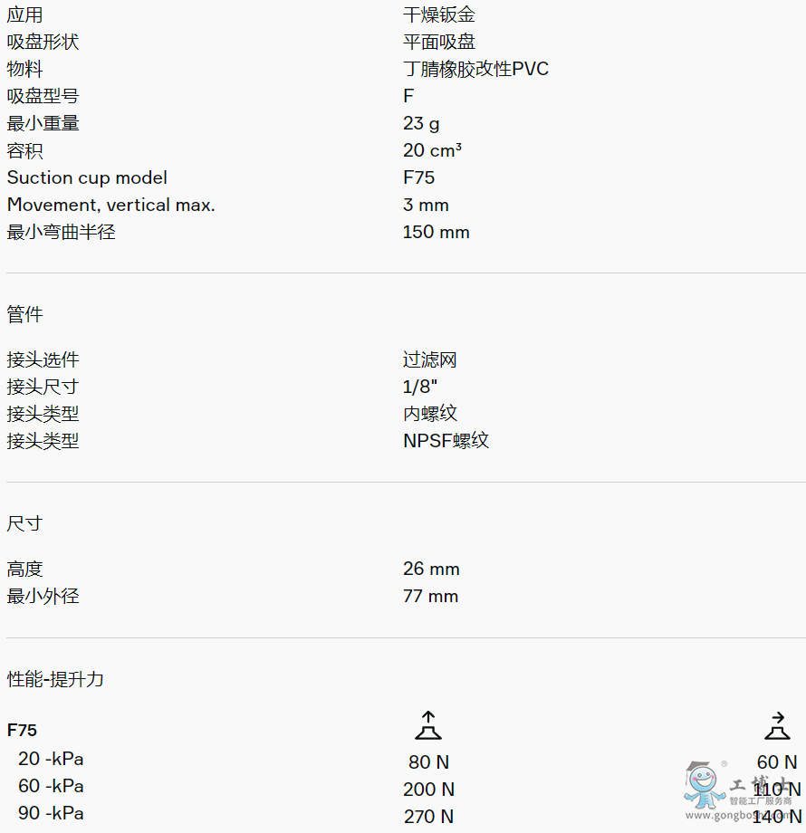 適用于硬紙板、鈑金、玻璃和多孔材料等平坦工件。該吸盤采用夾板結(jié)構(gòu),不僅可防止工件被吸入吸盤內(nèi)部而導(dǎo)致變形,而且在提升力平行作用于工件表面時(shí)還能增加摩擦力。產(chǎn)品穩(wěn)定性好,在工作期間幾乎不會(huì)發(fā)生任何偏移。