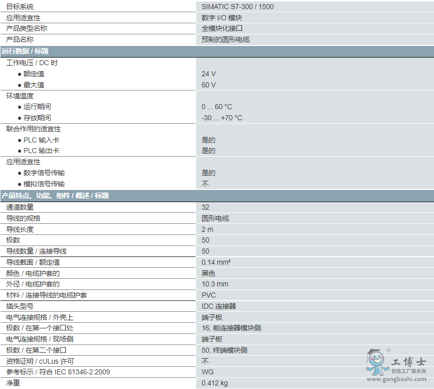 連接導線,未屏蔽 用于 SIMATIC S7-300/1500 0.14mm2 在前連接器模塊(4x16 極) 與連接模塊(1x50 極)之間 帶 IDC 連接器,L = 2.0 m。
